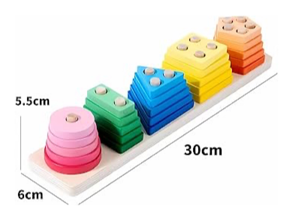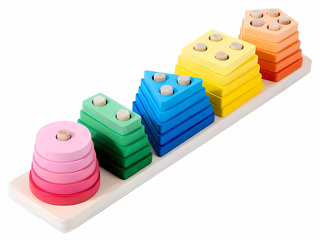 این ست شامل اشکال هندسی متنوع (دایره، مربع، مثلث، پنجضلعی و مستطیل) در رنگهای مختلف است که به کودک کمک میکند اشکال و رنگها را به راحتی تشخیص دهد.